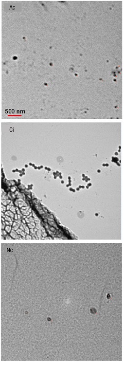 In general, the particles had a spherical shape (Figure 3), with an average diameter of 102.2 ± 20.1 nm for Ac, 198.4 ± 17.6 nm for Ci and 160.1 ±54.1 nm for Nc (Figure 4). Because the dimensions of the nanoparticles are in the range of 1 to 100 nm (Samyn, Barhoum, Öhlund, & Dufresne, 2018), the suspensions used in the present study were not catalogued as nanofluids.