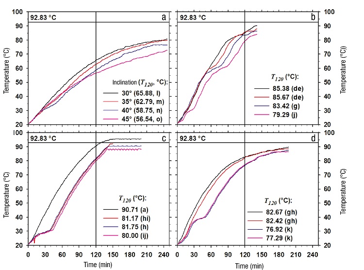 From Equation (1), the boiling temperature of pure water at the atmospheric pressure at the experimental site (77 993 Pa; Chapingo, Mexico) is 92.83 °C. Among the different systems, the one that reached this condition in less time corresponded to the one that used water incorporated with Chinese ink as process fluid and an inclination angle of 30°, which occurred at 128 min of exposure to thermal radiation (Figure 5). Based on the above, the time of 120 min was considered as the process study time (test =t120 ) in order to evaluate the temperature change in a condition without phase change.