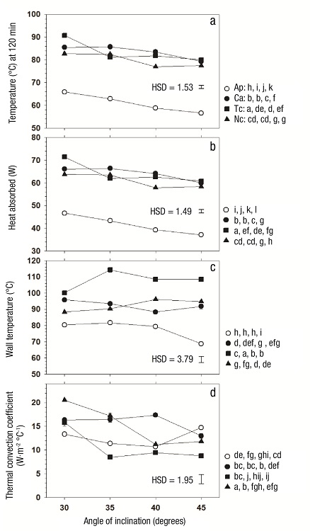 The temperature reached on the internal surface of the pipe wall containing the process fluid (TP ) was significantly affected by both variation factors, and the interaction between them was also significant (Table 1). The analysis of major effects showed that the highest average wall temperature (P ≤ 0.05) was recorded in the system that used Ci, followed by the one that incorporated Ac and Nc, without difference between them, and finally by the one that used Pw. Since the highest liquid temperatures and the highest values of heat absorbed were recorded with the lowest inclination angles, it was expected that the highest solid surface temperature would have corresponded to the lowest angles; however, although there was a difference caused by the different angle of inclinations, a no clear trend was identified.