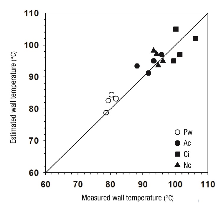 Physical measurements of the wall temperature of the process fluid container pipe were made with an infrared surface temperature sensor (Multimeter EXTECH™, EX810, USA), until a stabilized condition was reached. The experimental data were compared with those estimated with the modeling routine through a one-to-one representation (Figure 7). The measured-estimated data pairs were subjected to a linear regression routine, from which a determination coefficient (R2 ) equal to 0.8083 was obtained, indicating that the estimate made using the Matlab® lsqnonlin.m routine was able to predict the system wall temperature data by 80.8 %. In particular, the data corresponding to Pw showed a tendency to be overestimated, but in the rest there was no clear trend of under- or overestimation. In general, the estimation of thermal parameters made with the model was considered acceptable.