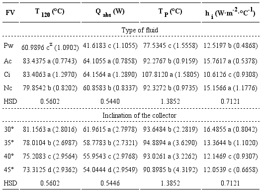 The temperature reached at 120 min (T120 ) was affected both by the type of process fluid and by the inclination of the collector, and there was even a significant interaction between both variation factors (Table 1). After 120 min of operation, all systems using particle suspensions had average temperatures between 79 and 84 °C, which were significantly higher (P ≤ 0.05) than the average temperature when Pw (61 °C) was used. The major effects analysis showed that the systems that used Ac and Ci caused the highest temperature at 120 min of operation, without significant difference (P> 0.05) between them, followed by the treatment with Nc and, finally, the system with Pw (Figure 5, Table 2).