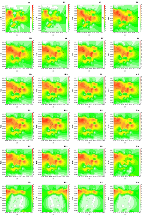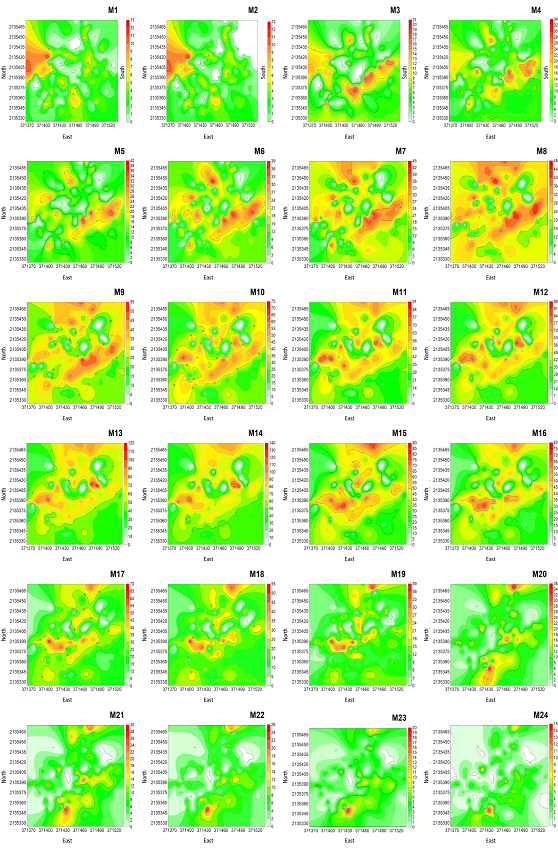 Density maps (Figure 1, 2 and 3) show the different aggregation centers. Each map shows geographic coordinates; at the bottom are the east coordinates and on the left side are the north coordinates. Figure 1 shows the largest infestation centers in the central and northern parts of the country. The months with the lowest density are distributed in the northern part, with a slight tendency towards the west side of the map, except for sample 22, which has an aggregation center in the southern part. An infestation percentage higher than 90 % was observed in most of the samples, which coincides with that reported by Lara-Vázquez et al. (2018) in the study on spider mites.