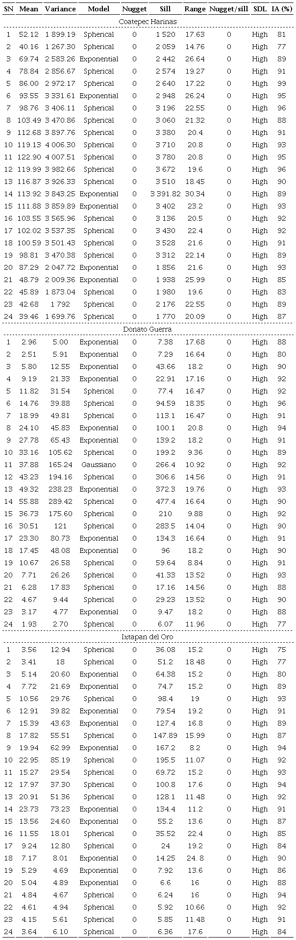 Table 1 shows the values of the parameters analyzed. In Coatepec Harinas, sill values were obtained from 1520 to 3780, and from 14.76 to 30.34 m in range, this value was the maximum distance at which there is a relationship between the data of each sample. The nugget effect values were, in all cases, zero; this means the sampling error is minimal and the sampling scale is correct (Rosii et al., 1992).