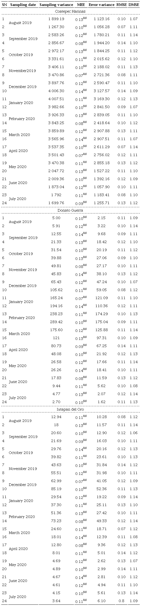 In the three municipalities studied, it was determined that the ranges of the semivariograms are sufficiently high. The above indicates that the adjusted models obtained represent, mathematically, the spatial behavior of the scale throughout the study area (Maldonado-Zamora et al., 2017). The cross-validation geostatistical parameters (Table 2) allowed validation of the experimental semivariograms of the three study areas at the different sampling dates.