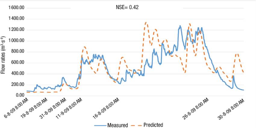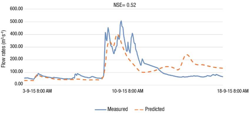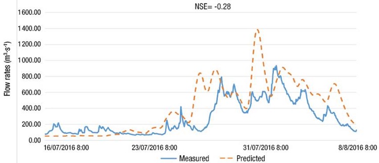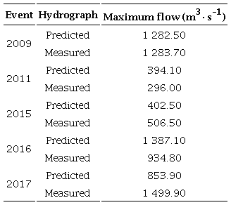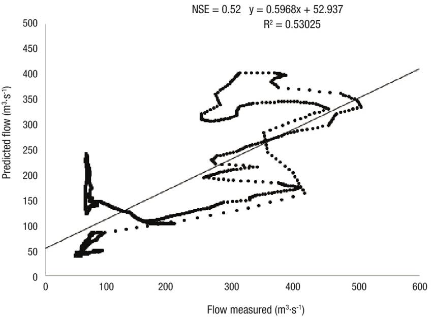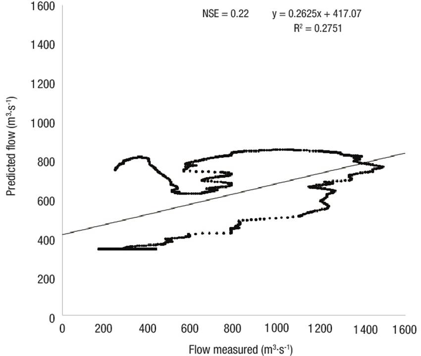 Results: The results collected in four of the five events were positive; the Nash-Sutcliffe efficiency (NSE) ranged between 0.22 and 0.52. The temporal behavior of the river, at times when it moved away from the flow value, preserved the variation trend.