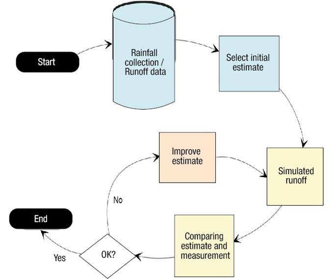 where Δxk is the parameter correction and should be such that the estimates tend toward the minimum value of the objective function. The objective function can be the goodness-of-fit measured with the NSE coefficient, RMSE or others.