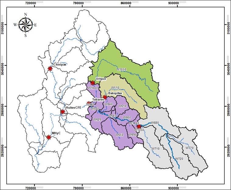 Once the available information on the watershed was reviewed, it was delimited with the HEC Geo-HMS 10.2 extension of ArcGis and based on the digital elevation model of the Instituto Nacional de Estadística, Geografía e Informática (INEGI, 2019a), up to station 25009 Bocatoma Sufragio of the Servicio Meteorológico Nacional (SMN, 2019a). With the same extension, the characteristics of the subbasins were obtained: slope, river length, lag time and HMS hydrological scheme (scheme or drawing with icons). The study area was delimited up to the Tubares station, which covers an area of 17 145.02 km2. The Huites, Miguel Hidalgo and Josefa Ortiz de Dominguez dams are outside the study area, immediately downstream of the Tubares hydrometric station. Tubares is in Chihuahua, approximately 39 km from the Huites Dam, Sinaloa.