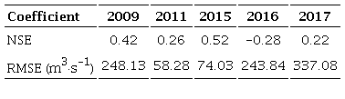 The model fit would be expected to have a relationship with the maximum flow measured; however, the results show no influence. For example, in the calibration of the 2009 event, an NSE coefficient of 0.42 was obtained for a maximum discharge measured of 1 283.70 m3·s-1 (Figure 7), while the 2015 validation had an NSE of 0.52, corresponding to a maximum flow measured of 506.50 m3·s-1 (60.54 % lower) (Figure 8), and the 2017 event, with a flow of 1 499.90 m3·s-1 (16.84 % higher), had an NSE of 0.22 (Figure 10). Moriasi et al. (2007) consider, for a calibration and validation on a daily scale, a value greater than 0.4 as satisfactory.