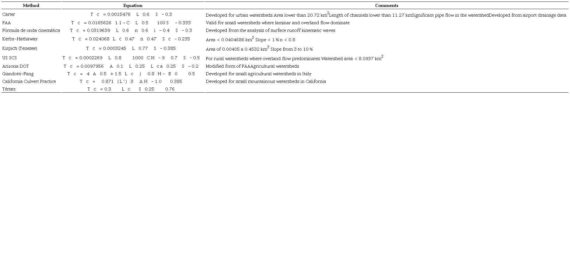 Hydrological models commonly use a time-related parameter, and the most used parameter is time of concentration (Campos-Aranda, 2010). Smith-Quintero and Velásquez-Henao (1995) indicate that the time of concentration is the time required for water to reach from the farthest point of the watershed to the exit point. Grimaldi et al. (2012) mention that, in practi/ce, empirical formulas are used to determine this parameter; one is that of Giandotti, which is highly used in Italy, another is that of Kirpich and that of NRCS, which are used in the USA. Table 4 shows different formulas to calculate this parameter.