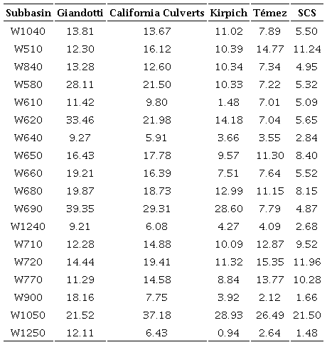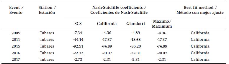 Table 7 shows the NSE coefficients derived from different concentration times. In 14 predicted events a better fit was obtained when the California Culvert method was used, three were better with SCS and two with Giandotti. The above coincides with the RMSE estimated, so the time of concentration calculated with the California Culvert Practice formula was used in this study.