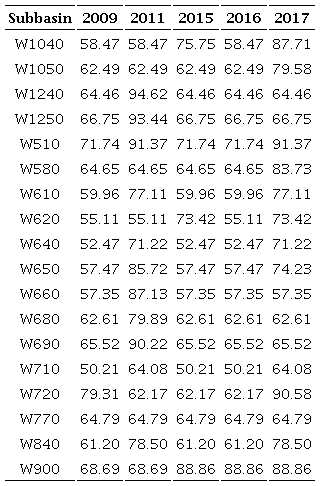 Figure 3 shows the subbasins corresponding to the modeling carried out, and their characteristics are shown in Table 5. The subbasins, up to the Tubares hydrometric station, have an average slope of 40.47 % and an average curve number of 79.04.