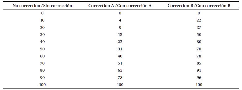 For each storm, the correction was made for antecedent rainfall accumulated five days before (Aparicio-Mijares, 2008) (Table 3). The conditions used for this purpose were: 1) correction A: when the antecedent rainfall is lower than 25 mm, 2) no correction: when the antecedent rainfall is greater than 25 and lower than 50 mm, and 3) correction B: when the antecedent rainfall is greater than 50 mm. A practical way to apply Equations 3 and 4 is shown in Table 3.