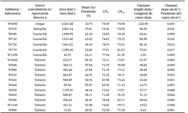 Fittings on the curve numbers showed three cases: 1) decrease in eight subbasins (two of them runoff directly into the Guerachic station and the others directly into Tubares), 2) four subbasins had no changes and 3) two subbasins had direct runoff into Tubares, and there was increase in the Batopilas subbasin, in two subbasins of Guerachic and in three subbasins of Tubares. On average, the decrease was 1.76 % and the increase was 7.63 %.