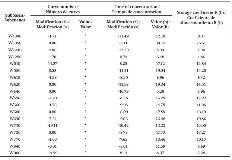 With respect to time of concentration, an average decrease of 9.56 % was recorded in 15 of the 18 subbasins, and an increase of 5.04 % in three subbasins (Batopilas, one in Tubares and one in Guerachic), which represent 12 % of the total study area.