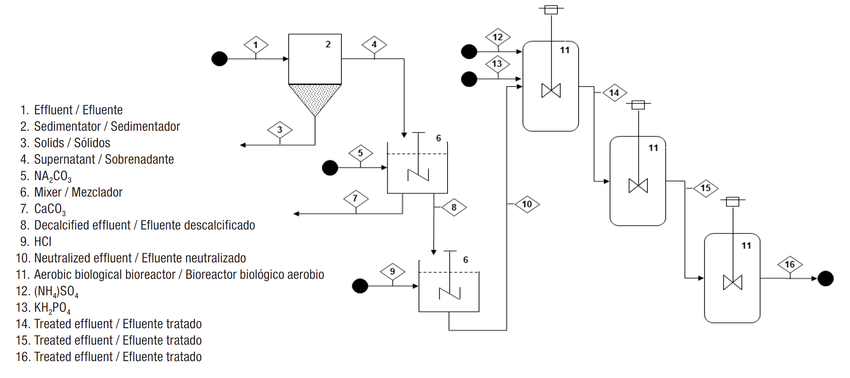 Salmerón-Alcocer et al. (2003) treated nejayote biologically with microorganisms isolated from soil contaminated by the same effluent. They used a triple-cascade bioreactor system (Figure 2) and used the residue as a culture medium for Paenibacillus amylolyticus, Pseudomonas putida and Acinetobacter spp. The results showed a decrease in COD from 28,000 to 3,612 ppm after treatment; moreover, the COD generated by supplying (NH4)2SO4 and KH2PO4 (with 1 and 0.3 g·L-1, respectively), as an enrichment of the medium, fell by 87.3 and 87.6 %, respectively. Additionally, due to the nature of the isolated bacteria, they may be of interest to the oil industry, since these microorganisms are used to degrade aromatic hydrocarbons and their derivatives (phenol, benzene, toluene and xylene) (Riser-Roberts, 1998).