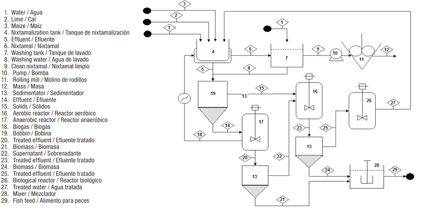 Durán-de Bazúa, Sánchez-Tovar, Hernández-Morales, and Bernal-González (2007) used an aerobic system to treat the byproduct of low-capacity (0.5 to 50 m3·day-1) nixtamal industries and an anaerobic-aerobic system for mills with greater capacity (2,500 m3·day-1) (Figure 3), in order to obtain reusable water in the same process and, at the same time, generate energy from the methane produced. The authors reported that in small mills the treatment was barely profitable, since the energy expenditure was higher. In the higher-capacity mill, production was 9.6 to 16.8 m3 of methane per ton of maize, which was used to generate energy, 23 kg of solid residue and 10.6 kg of biomass, with which pellets for fish feed were made. In addition, the treated water was reused.