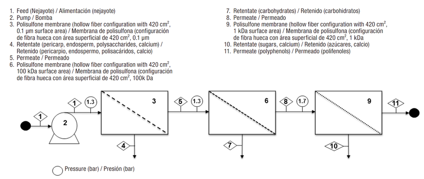 Castro-Muñoz and Yáñez-Fernández (2015) used a coupled membrane system, better known as an "Integrated Membrane System," defined as a sequential membrane operations design. The objective of the study was to analyze the fractionation of nejayote using three separation stages. The equipment was composed of three polysulphone hollow fiber membranes (MF = 0.2 μm, UF = 100 kDa and 1 kDa). The integrated membrane design was able to reduce in the permeate the total soluble solids (100 %), turbidity (99.5 %) and total organic carbon (87.2 %), as well as concentrated the polyphenols (79.94 %) (Table 2); in addition, the retentate stream maintained 92.5 % of the carbohydrates. The results showed that each membrane is efficient in the removal of solids. Similarly, by the yields obtained in the recovery of the components present, the methodology evaluated showed a high potential to be applied in the treatment of nejayote in the nixtamalization industry.