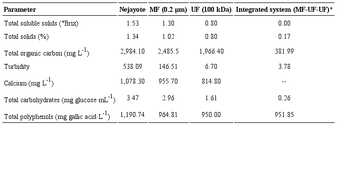 Castro-Muñoz, Orozco-Alvarez, Cerón-Montes, and Yáñez-Fernandez (2015b) used an ultrafiltration (UF) system with a 100 kDa membrane, called a nominal molecular weight cut-off (NMWCO). This system allowed reducing the components present in the effluent, so that in the permeate the total soluble solids were reduced by 20 %, turbidity by 95.40 %, calcium content by 14.74 % and the organic load, in terms of total organic carbon, by 29.38 % (Table 2), whereas the retentate after UF concentrated the carbohydrates by 46.69 %.