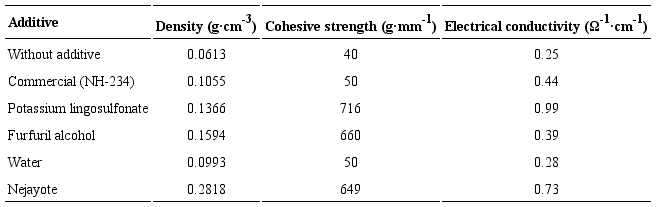 González et al. (2003) used nejayote as an agglutinant to form carbon black (CB) agglomerates. They analyzed the properties presented by CB using the effluent and other additives (water, furfuryl alcohol [FA] and potassium lingosulfonate [PLS]). Their results showed that nejayote pellets have cohesive strength similar to that of pellets generated with commercial additives, and electrical conductivity exceeding that of pellets manufactured with FA and very similar to PLS ones (Table 4). This shows that despite being a waste material, nejayote can be used as an agglutinant not only of CB, but also of other materials with applications in the wiring or insulator industries. In this regard, its use as an input represents an interesting application in the polymer industry.