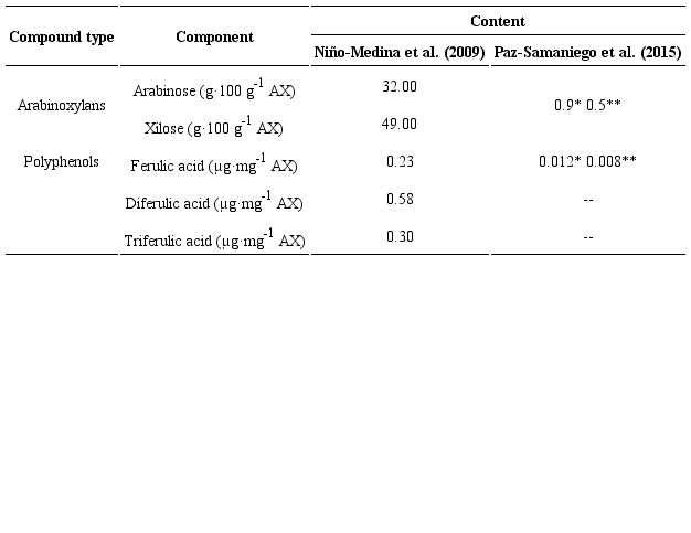 The variation in results in the two reports is related to the quality of the raw materials (maize and alkaline agent) used in nixtamalization and to the conditions under which the process was carried out. However, because of the functional characteristics possessed by the AX, they are considered important for the food industry as stabilizing agents since they provide viscosity, texture and structure to bakery products (Matos-Chamorro & Chambilla-Mamani, 2010). In addition, the feruloylated AX are an important source of antioxidants and dietary fiber, not only relevant in the making of bread and beer, but also in the pharmaceutical industry that has demonstrated the link between antioxidants and chronic diseases (Niño-Medina et al., 2010).