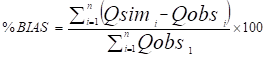 This indicator can be thought of as the average of residuals as a fraction of the average flow (Equation 1). It is also equivalent to the cumulative flow volume error relative to observed volume, which is usually known as water balance error in the hydrologic modeling literature. In general, lower values of % BIAS indicate better model efficiency.