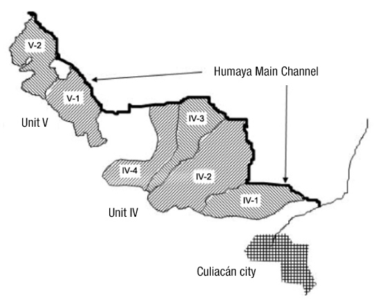 The Humaya main channel (HMC), opened on October 8, 1952, belongs to Culiacán-Humaya Irrigation District 010 and is one of the most important in Mexico. It is located in the central region of the state of Sinaloa, passing through the municipalities of Culiacán, Navolato, Mocorito, Angostura and Salvador Alvarado. The district has a current irrigated area of 212,374 ha, of which 106,835 ha belong to ejidos and 105,539 ha to small properties (Comisión Nacional del Agua [CONAGUA], 2005). For administrative purposes, the district is organized into 12 irrigation modules, of which six are supplied by the HMC (Figure 1).