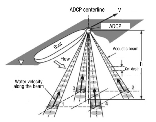 The coordinates (x, y, z) of the bathymetric study were determined with an acoustic Doppler current profiler (ADCP; model M9, SonTek brand) (Figure 2) with an accuracy of 1 % of the mean value and a resolution of 0.001 m, using a 0.5 MHz ultrasonic transducer. This instrument calculates the water velocity components in different layers in the three directions. As its name implies, this equipment uses the Doppler effect, as it transmits sounds at a fixed frequency and captures the echoes returned by water reflectors (Lee, Mukai, Lee, & Lida, 2008). The reflectors are small microscopic particles of sediment or plankton present naturally in water (Hiebl & Musso, 2007). When the sound sent by the ADCP reaches the reflectors there is a frequency displacement proportional to the relative speed between the ADCP and the reflectors. Part of the sound is reflected once again to the ADCP. This second displacement is used to calculate the speeds (Figure 3).