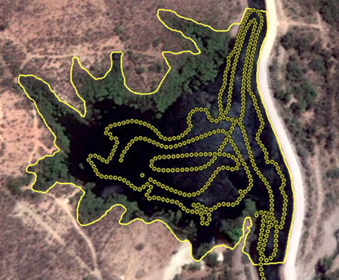 To perform the reading of the coordinates in each dike, the ADCP and the RTK were mounted on a motor boat (Figure 4). In general, a tour was made along the edge of the dike, sweeping every 20 m in both directions. This allowed the collection of points that associate the depth levels with the position within the dikes. As an example, in Figure 5 the route and the position of the sampled points in Dike 1 were schematized. The equipment was programmed to perform the automated capture of the coordinates: ADCP every 4 s and RTK every 10 s.