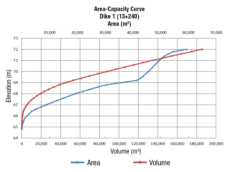 The contours and the DEM (Figure 7) allowed obtaining the area and volume data for each elevation. This information allowed generating the elevation-area-capacity graphs of each dike. Figure 8 shows the graph of dike 1, showing the increase in volume (red curve, lower horizontal axis) and area (blue curve, upper horizontal axis) as a function of depth (vertical axis). For convenience, this last datum is expressed in masl, reaching the bottom at 64.8 masl and the water mirror at 72 masl, giving a depth of 7.2 m. The graph allows quickly identifying the volume and coverage area as a function of the height reached by the water in the dikes.