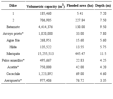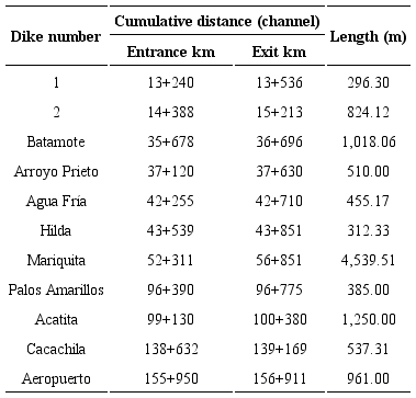 The HMC is supplied by the Adolfo López Mateos dam, is 156 km long and has a large number of structures (26 reservoirs, a 1,310-m-long tunnel and 12 dikes; Pedroza-González & Hinojosa-Cuéllar, 2014). During its construction, in order to maintain depressions and take advantage of the runoff of some of the streams that cross the HMC, dikes were placed at different points along the channel (Table 1), whose initial capacity was determined with the volume that can be stored at different elevations depending on the channel’s operating levels.