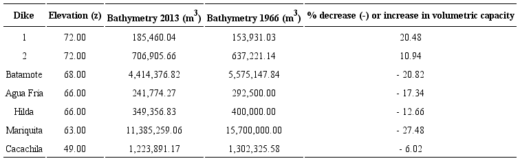 Results and discussion: Dikes 1 and 2 increased their capacity due to recent maintenance and enlargement work. On the other hand, Batamote, Agua fría, Hilda, Mariquita and Cacachila showed a loss of volumetric capacity (of 16.87 % on average), most likely due to the sediment problem.