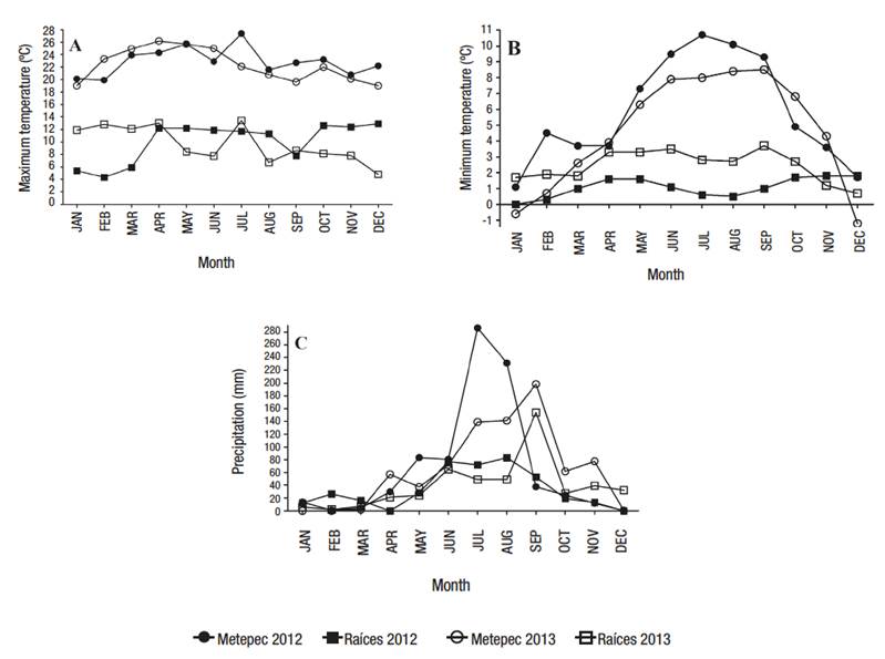 Fertilization doses applied in Raíces were 200-300-200 (N-P2O5-K2O) kg·ha-1, plus 50 kg·ha-1 of micronutrients, and 1 t·ha-1 of chicken manure. In Metepec, the fertilization dosage was 200-200-200 (N-P2O5-K2O) kg·ha-1, plus 50 kg·ha-1 of micronutrients, and 1 t·ha-1 of chicken manure. Fungicides and pesticides were applied as required in order to control pests and diseases. The maximum and minimum temperatures, as well as the precipitation in each location is shown in Figure 1.