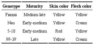 Four genotypes were evaluated including three clones (Nau, 5-10, 99-39) and a commercial variety (Fianna) (Table 1).