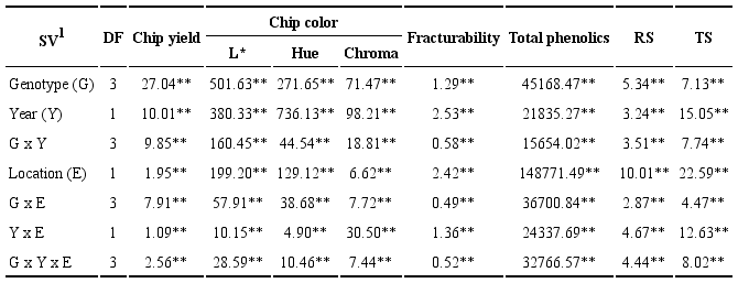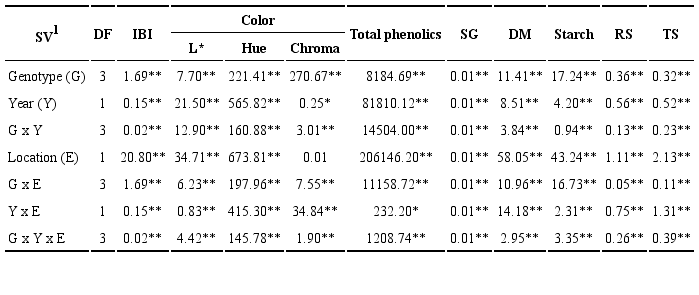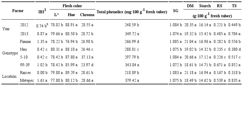 Analysis of variance of the physicochemical properties of tubers showed significant effects (P ≤ 0.05) between genotypes (G), years (Y), and locations (E), except for chroma, in which no significant differences were found between locations (Table 2). All second-order and G x Y x E interactions were significant (Table 2).