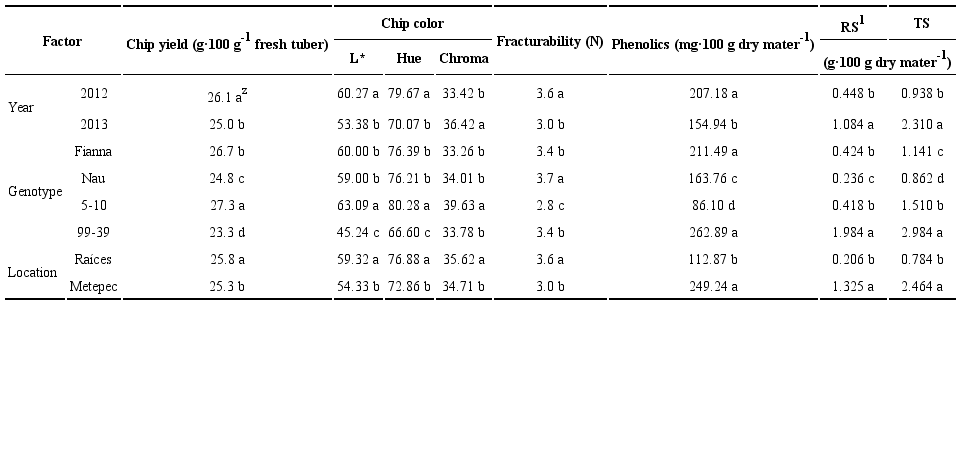 Metodología: Se cultivaron cuatro genotipos (Fianna, Nau, 5-10 y 99-39) en dos localidades (Metepec y Raíces) y dos años consecutivos (2012 y 2013). En los tubérculos se evaluó el manchado interno, la gravedad específica (GE), el almidón, los azúcares y los fenoles totales, posteriormente se evaluó el rendimiento, color y textura de las hojuelas fritas.