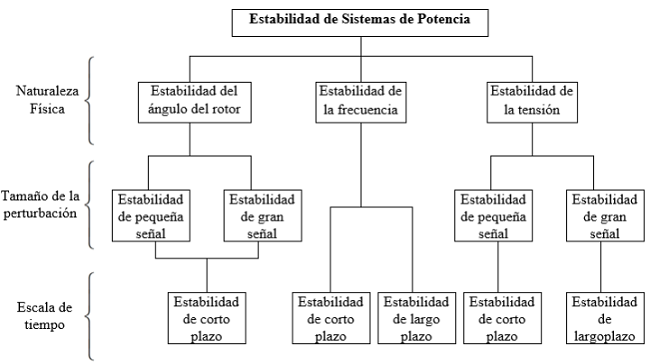 La estabilidad de un SEP puede ser clasificada como afirman Gonzalez-Longatt (2006) y Zea (2012) de acuerdo a su naturaleza física, tamaño de la perturbación y escala de tiempo. En la Figura 1 se muestra un resumen de la clasificación del problema de estabilidad en los SEP.