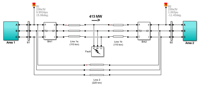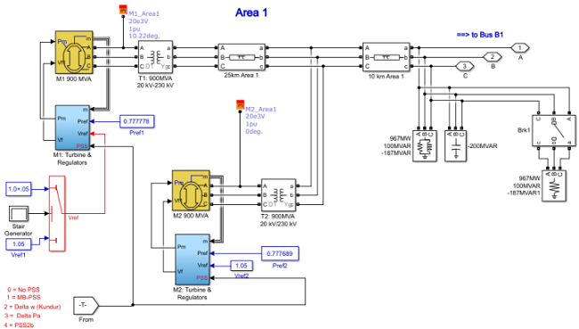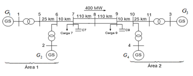 El sistema de prueba presenta dos áreas totalmente simétricas unidas entre sí por dos líneas de trasmisión de 230 kV de 220 km de longitud. Fue diseñado en Kundur (1993) para realizar estudios de pequeñas señales en SEP grandes. A pesar de su pequeño tamaño, imita muy de cerca el comportamiento de los sistemas típicos en funcionamiento real. Cada área está equipada con dos generadores idénticos de 20 kV / 900 MVA, las máquinas síncronas tienen parámetros idénticos, a excepción de las inercias que son H = 6,5 en el área 1 y H = 6,175 en el área 2. También se suponen plantas térmicas con reguladores de velocidad idénticos en todas las ubicaciones, además de excitadores estáticos rápidos con una ganancia de 200. La carga se representa como impedancias constantes y se divide entre las áreas de tal manera que el área 1 está exportando 413 MW al área 2. Bajo estas condiciones el sistema está al límite de su estabilidad estática. El flujo de carga toma como nodo de balance (de referencia) la máquina 2 y se considera que todos los generadores producen alrededor de 700 MW cada uno. Además, las pérdidas de transmisión y generación pueden variar dependiendo del nivel de detalle con el cual se incorporen los datos de los elementos presentes en el SEP. En el esquema también está presente el bloque Fault, con el cual se puede establecer el tiempo, duración y tipo de cortocircuito.