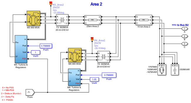 En el esquema de Simulink, están implementadas para cada generador tres variantes PSS: