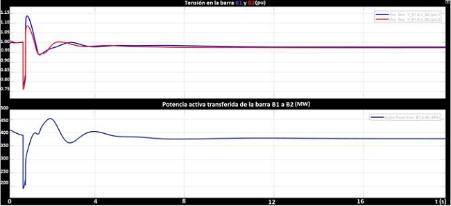 En el caso 2, Figura 10, puede constatarse que con la instalación del MB-PSS, ante la ocurrencia de la contingencia, se pierde la estabilidad del sistema pues las oscilaciones tanto de voltaje como de potencia activa transferida no se amortiguan, no sucediendo así con el PSS2B las cuales se amortiguan alrededor de los 12 s, por lo que la instalación de este PSS es la idónea.