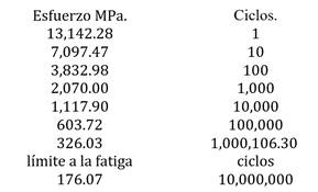 Adicionalmente se puede generar una curva de esfuerzos como se muestra en la ecuación 6 (Shigley y Mischke, 1995), con dicha ecuación se puede conocer aproximadamente a los cuantos ciclos fallará el punzón, con los datos obtenidos se calcula que el punzón fallará al 1,000,106 ciclos de carga cuando el esfuerzo de fatiga se ha calculado a 326.039 (MPa).
