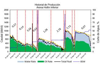 En este caso, se observa que conforme la producción de agua va incrementando, la producción de petróleo disminuye m=1.76, 0.57 y 0.14 (donde m= pendiente). La disminución de la producción inicial puede deberse a dos fenómenos: el primero debido al cambio en la permeabilidad relativa por el incremento de la saturación de agua, por presencia del acuífero constante en el reservorio Hollín (Baby et al, 2014) , y el segundo debido a que existe una interacción entre el reservorio y el agua, lo cual provoca el comienzo de la migración de finos debido al intercambio iónico de presente en el reservorio y el agua que intruye como parte del mecanismo de producción natural del reservorio. (Civan, 2000). Figura 1.