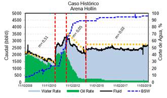 Este segundo caso muestra una situación diferente al previo, observa una declinación de la producción menor (m=0.51) en aproximadamente 2 años conforme aumenta el corte de agua, se procede a realizar un reacondicionamiento con el objetivo de restaurar la producción, sin embargo, al cabo de un año el corte de agua aumenta hasta un 90% por lo que la producción declina rápidamente.