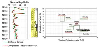 Para la detección y comprobación de los minerales expuestos en las pruebas de difracción de rayos X se utilizó registros eléctricos, la curva de rayos gamma y los registros litológicos, Figura 4 , se tomó datos de la curva de rayos gamma del campo de estudio para un ambiente fluvial de donde proviene la caolinita e illita (Slatt, 2006), el gráfico de factor fotoeléctrico vs la relación torio-potasio obtenido de los registros eléctricos del campo de estudio, muestra que el mineral que abunda en mayor cantidad es la caolinita.