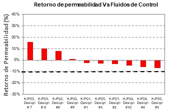 De acuerdo con los resultados obtenidos, existen retornos de permeabilidad del 15% y una pérdida de permeabilidad de hasta el 9 % lo cual es aceptable para los diferentes diseños de fluidos de control.