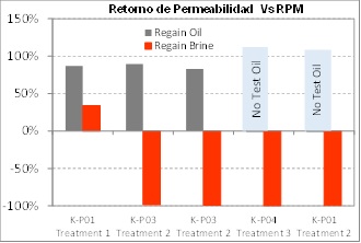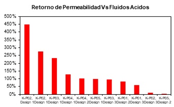 En el caso de las pruebas de retorno de permeabilidad para fluidos ácidos se observa un efecto positivo en los diferentes escenarios, ya que se conserva la permeabilidad hasta un 400%; sin embargo, este tratamiento se debe mantener durante la vida productiva del pozo para que los niveles de producción sean rentables.