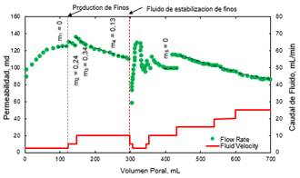 Una vez que se determina la velocidad crítica de 10 ml/ min, se bombea el fluido estabilizador de finos y observamos una variación de la permeabilidad hasta que alcanza la velocidad de 10 ml / min (m = 0), donde observamos que la permeabilidad permanece constante, es decir no hay pérdida de permeabilidad, inclusive se logra aumentar la velocidad del fluido hasta 25 ml/min y no se observan cambios drásticos en la permeabilidad demostrando que el fluido estabilizador de finos funcionó.