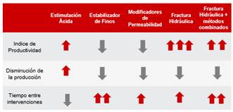 La estimulación ácida da un IP alto, sin embargo la producción va a disminuir rápidamente por lo tanto el tiempo de intervenciones es constante; el estabilizador de finos da un IP bajo, sin embargo la producción no declina rápidamente y los tiempos de intervención del tratamiento son largos; los modificadores actúan de igual manera que los estabilizadores de finos sin embargo el tiempo de intervención es mucho más corto; y por último la fractura hidráulica y métodos combinados me ofrecen IP altos en ambos casos la diferencia radica en los tiempos de intervención, depende de lo que la empresa operada necesite.