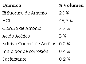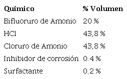 Bifluoruro de Amonio: Reacciona con el HCL para formar ácido fluorhídrico, HF. El HF disuelve las arcillas de migración como la caolinita.