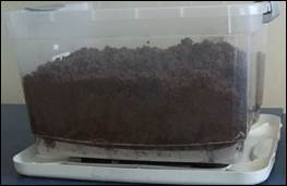 En la Figura 1, se muestra el lombrifiltro empleado para el desarrollo de la planta de tratamiento de aguas residuales. Su estructura está compuesta por un recipiente de plástico, que cuenta con una capa de piedras de diámetros entre 2,5 y 10 centímetros, una capa de grava, una de aserrín y viruta, y finamente una capa de lombrices rojas, adquiridas en Lombriart.