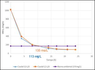 La eficiencia del lombrifiltro fue determinada una vez alcanzada una concentración de DBO5 igual al límite permitido en la Resolución Nº2-SA-2014 de la Secretaría del Ambiente.
